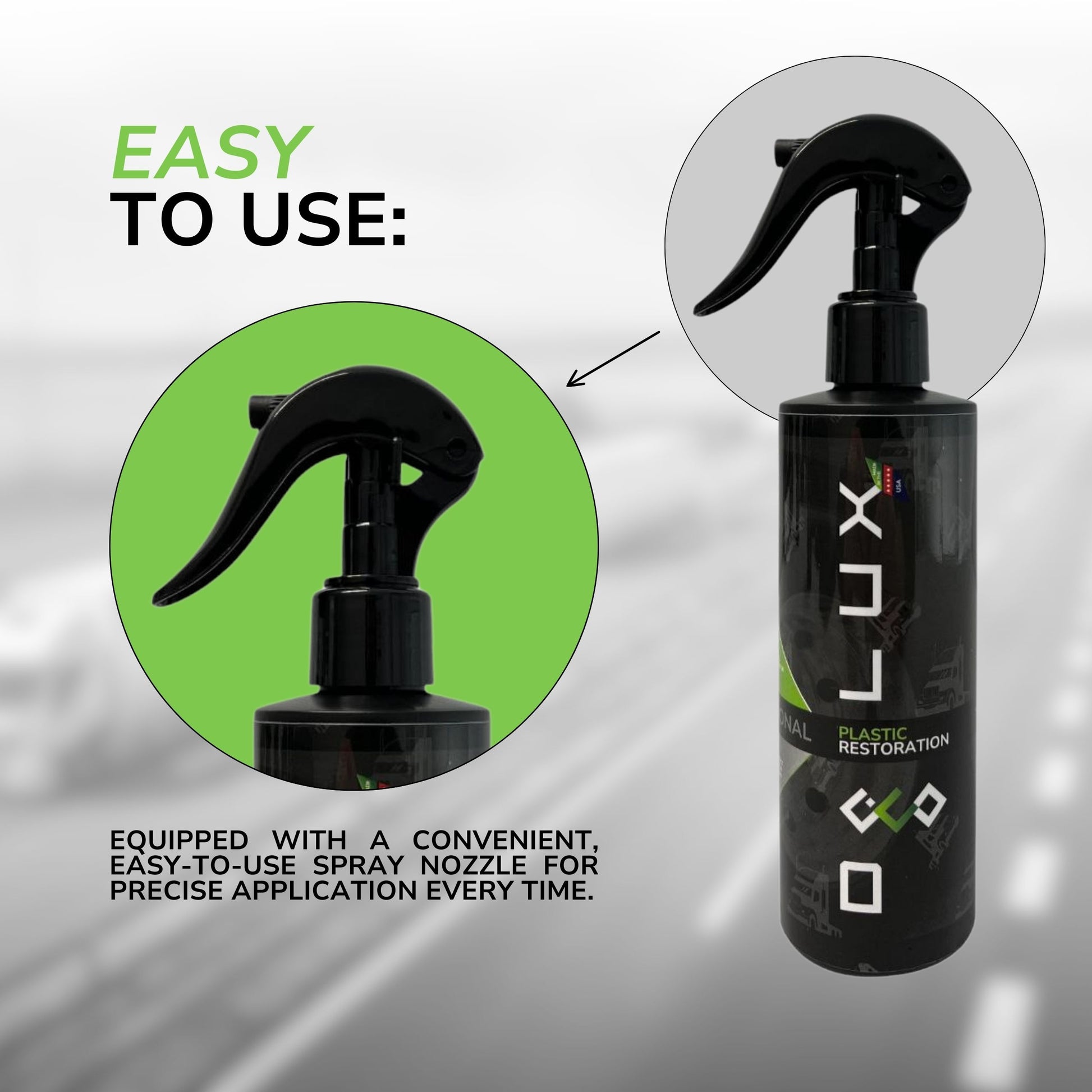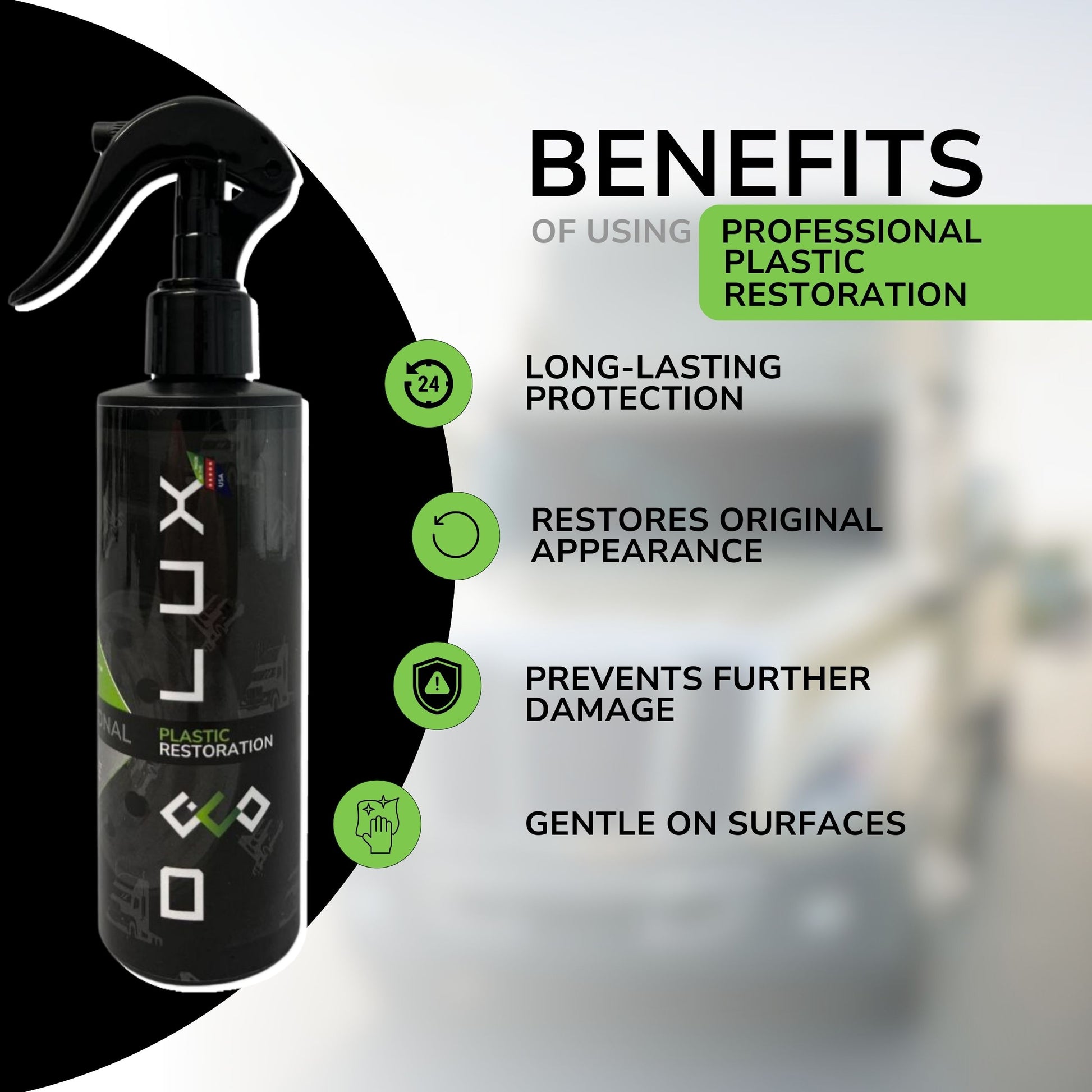 This all-in-one Professional Plastic Restoration treatment is specifically designed for commercial truck interior surfaces, revitalizing plastics, rubber, tires, and vinyl to leave them looking sleek and vibrant. Our advanced water-based formula effectively restores surfaces, providing a long-lasting, super glossy finish without any oily residue.