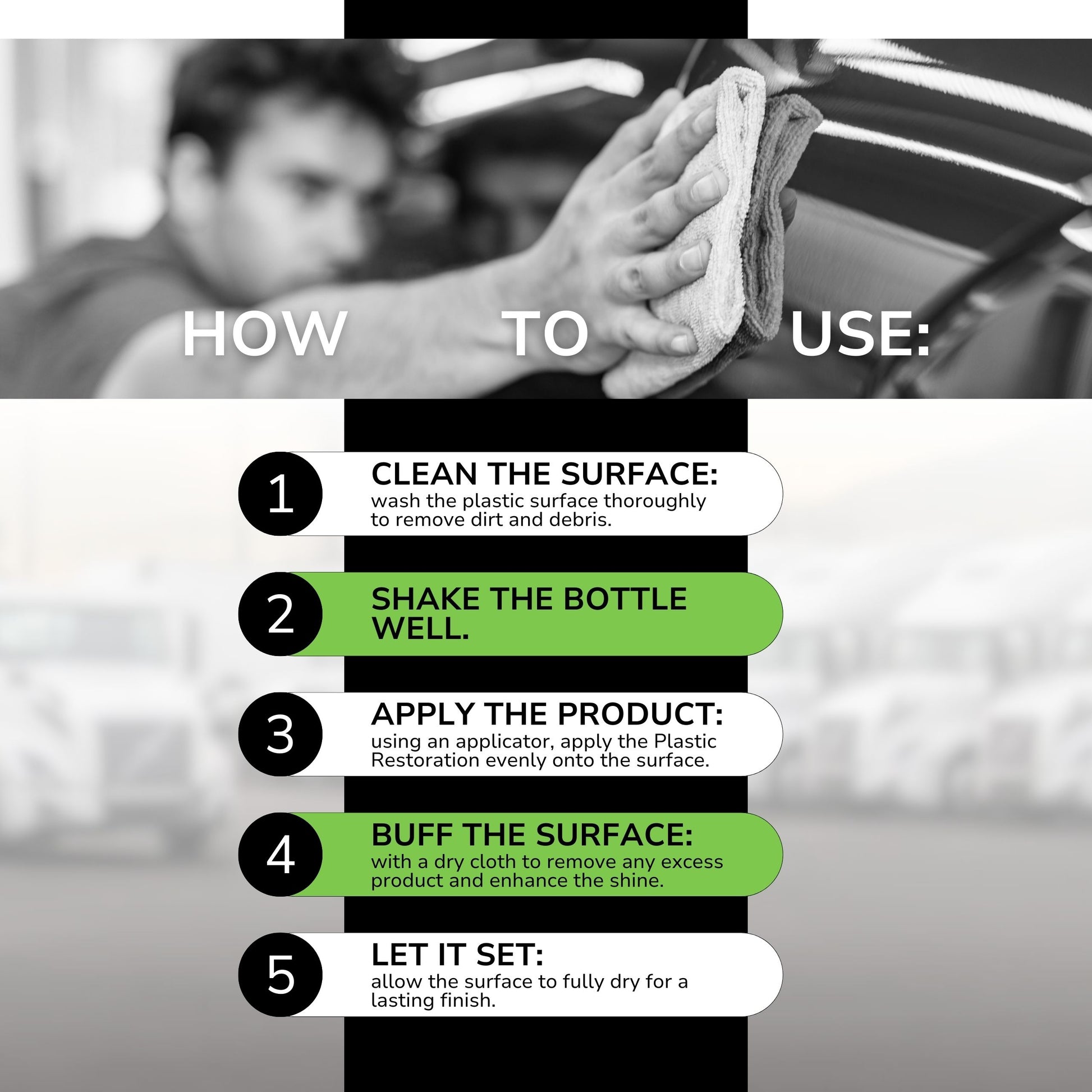- Ideal for exterior surfaces like tires and plastic trims